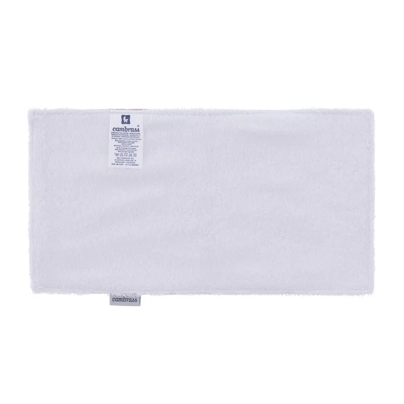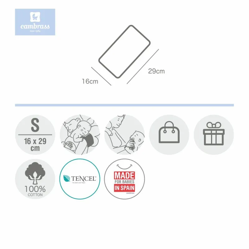 El Seca babas de Cambrass tiene forma rectangular y está fabricado por una parte con tejido 52% poliester 48% algodón de las colecciones Cambrass y por la otra parte de algodón (70%) y de fibras TENCEL™ (30%), una fibra botánica que aporta absorción, suavidad y frescura. Además el TENCEL™ no retiene la cal del agua en sus lavados por lo que siempre mantiene intacta su suavidad. Se puede utilizar como gasa para secar las babas del bebé, como toallita para colocar sobre el hombro del adulto o como toallita empapadora del sudor debajo de la cabeza del bebé.