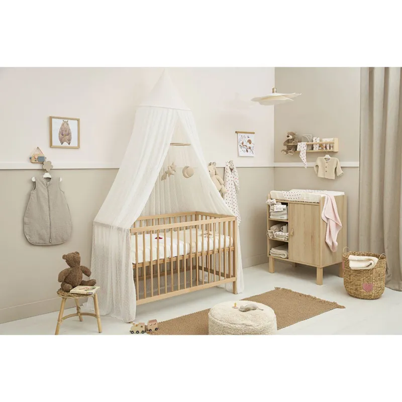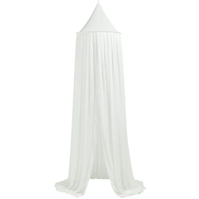 El dosel aporta un ambiente elegante y clásico al dormitorio de su hijo. Con sus sutiles lunares bordados, el dosel crea un ambiente elegante sobre la cama. No sólo es bonito, sino que también ofrece una sensación de seguridad adicional a su hijo. No sólo queda genial con una cuna, sino que también con una cama infantil, una cama juvenil o una cama individual adquieren una belleza encantadora de una sola vez gracias a esta mosquitera. (no incluye la estructura) Está fabricado en poliéster 100% y está disponible en un elegante color blanco. Se cuelga fácilmente con un gancho en el techo o en un poste de pico.