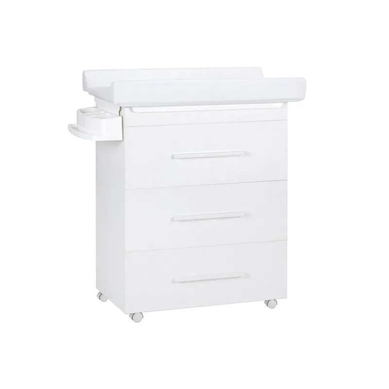 Equipado con tres amplios cajones, el mueble ofrece un amplio espacio de almacenamiento para todo lo que necesites tener a mano durante el baño, desde pañales y toallas hasta productos de cuidado para el bebé. Las cuatro ruedas permiten mover el mueble fácilmente de una habitación a otra, facilitando la movilidad y el acceso.