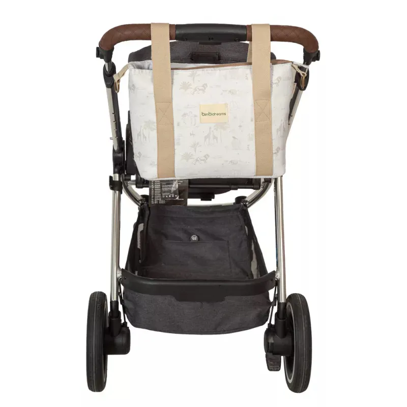 Cuenta con asa larga para llevar al hombro o cruzado, y dos asas cortas para colgar fácilmente del cochecito.