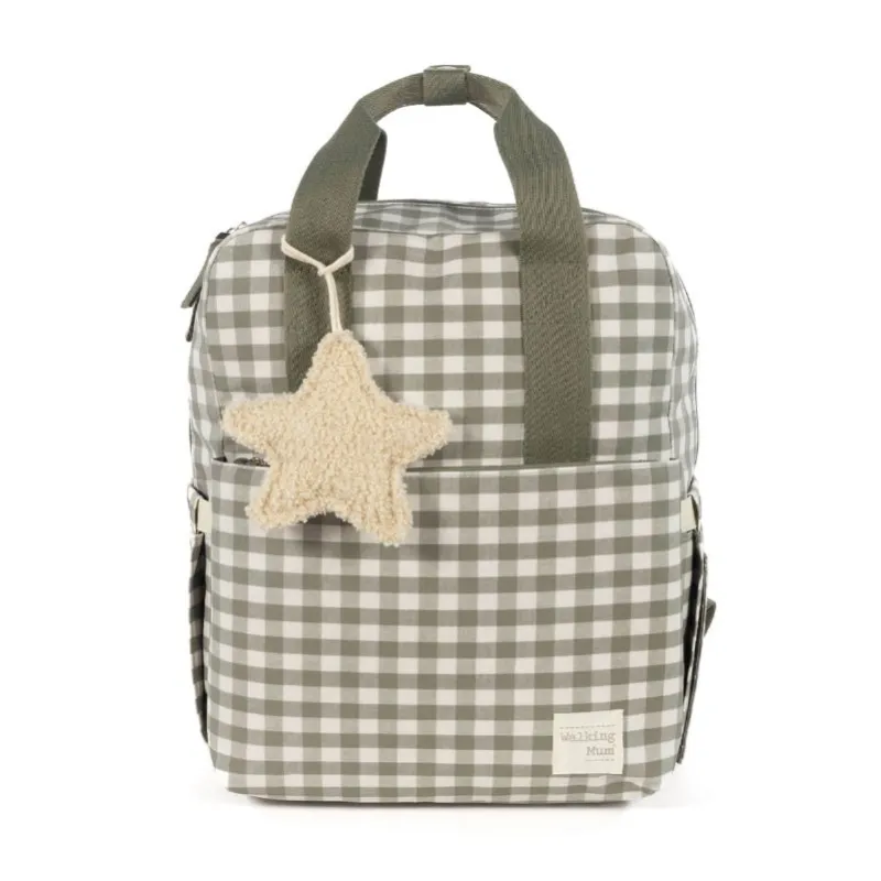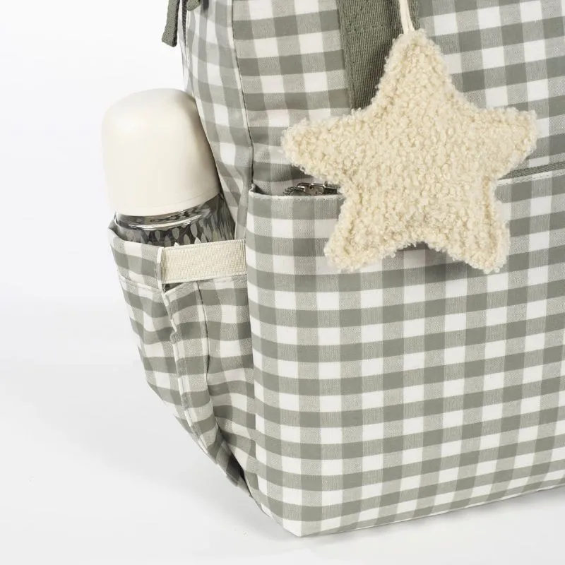Una bolsa canastilla y mochila al mismo tiempo, muy moderna y urbana, ideal para llevar tus cosas y las de tu bebé, con mucho estilo, a todos sus paseos. La bolsa Caetana diseño de cuadros para silla de paseo es un modelo multifunción muy ligero, resistente y de gran capacidad para llevar todo lo necesario en el paseo del bebé. Incluye un charm en forma de estrella donde puedes bordar el nombre de tu bebé para personalizar el bolso.