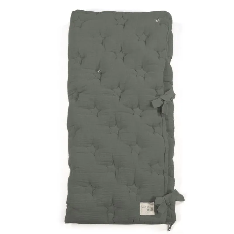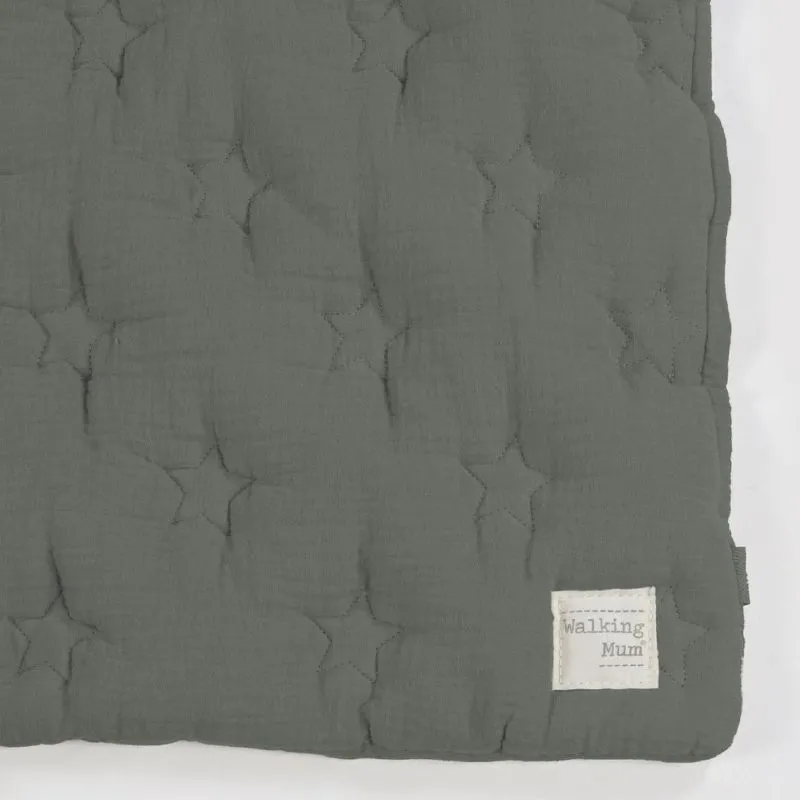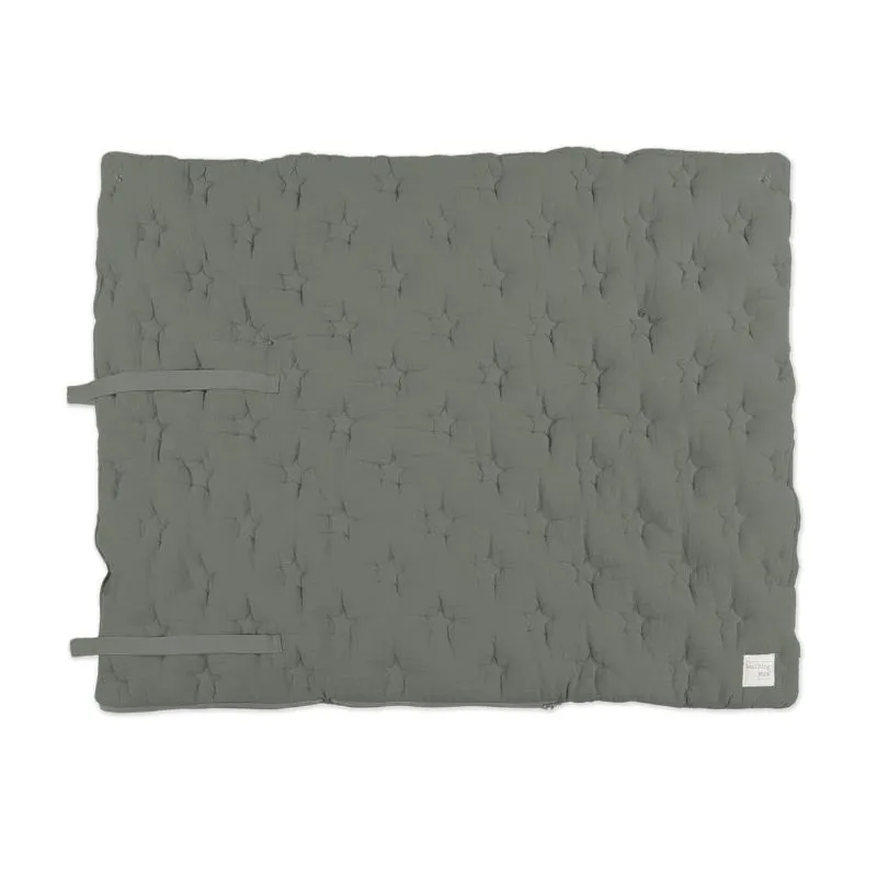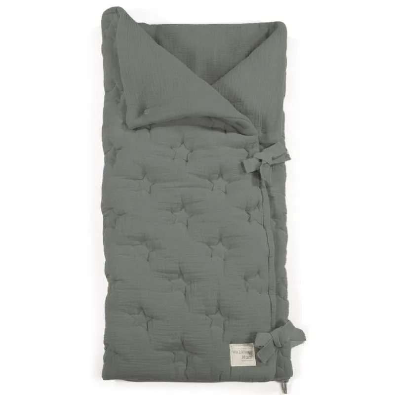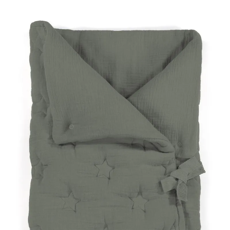 Arrullo/Manta Caetana - Stone confeccionado en suave muselina de 100% algodón con un delicado bordado de estrellas en tono beige. Ideal para los primeros días del bebé, se puede utilizar en el capazo o como manta en la cuna, ofreciendo calidez y comodidad gracias a su práctico cierre con velcro y cremallera en la parte inferior.
