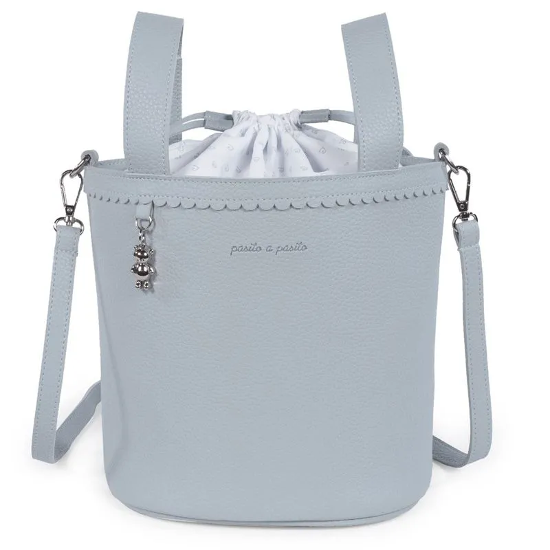 Bolso tipo cubo para cochecito de Pasito a Pasito, confeccionado en cuero ecológico de alta calidad. Presenta un elegante borde festoneado y un encantador dije de osito de peluche en metal, aportando un toque distintivo. Es el complemento perfecto para transportar de manera cómoda y estilizada los objetos esenciales de tu bebé durante los paseos.