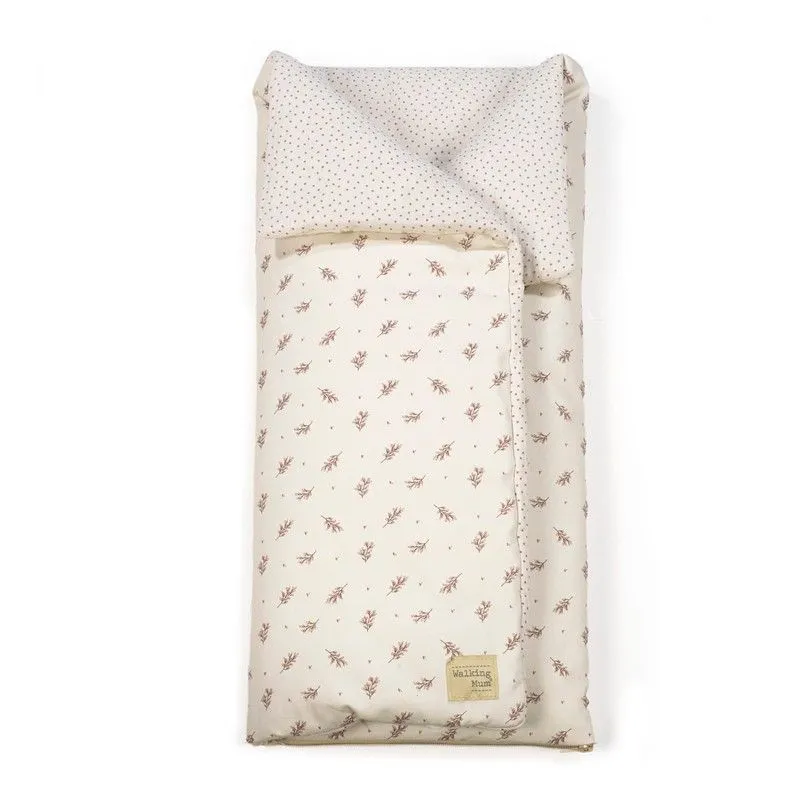 Saco arrullo o saco manta Walking Mum Mimosa fabricado con suave muselina de algodón. Ideal para los primeros días del bebé, paseos en capazo y como manta para la cuna. Con cierre tipo sobre con velcros y cremallera en la parte inferior.