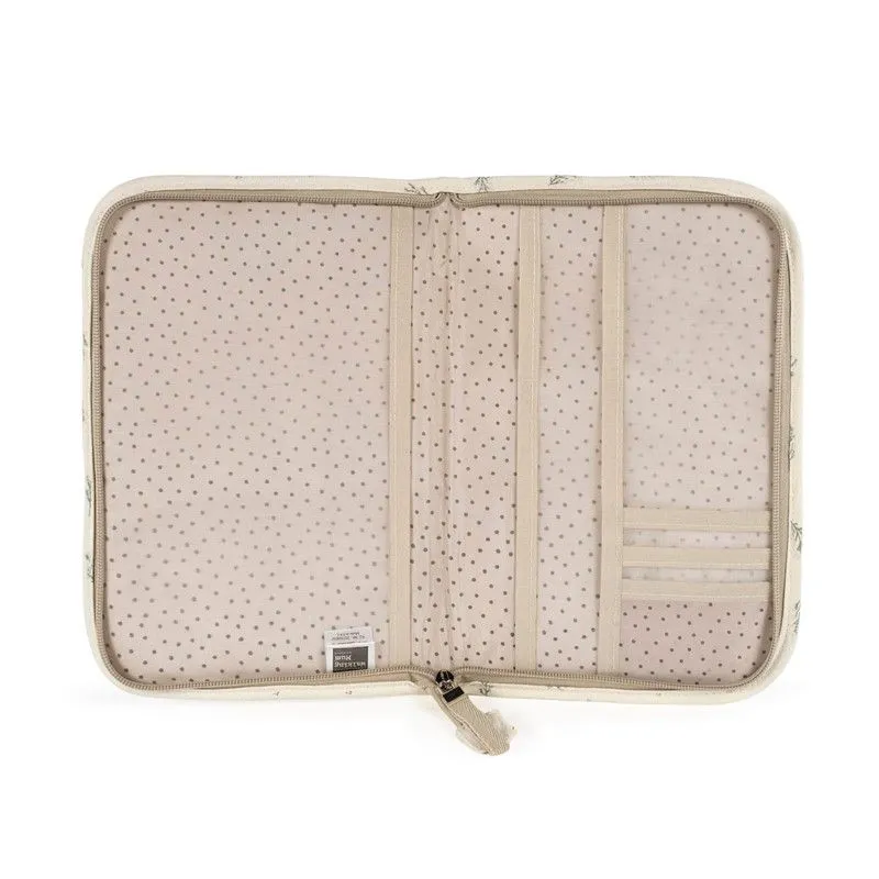 Libro de nacimiento Mimosa Walking Mum con estampado floral, funcional carpeta portadocumentos a juego con la bolsa de maternidad. Ideal para mantener ordenada la documentación y papeles médicos de tu bebé. Elaborado en tela estampada, con múltiples bolsillos para una mejor organización. Práctico cierre de cremallera para guardar seguro el libro de nacimiento y documentos del bebé. Fabricado en 100% algodón con tratamiento waterproof.