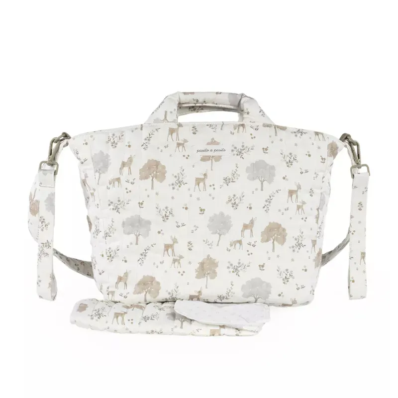 Presenta un tierno estampado de ciervos y árboles, perfecto para quienes prefieren estilos sutiles y neutros.