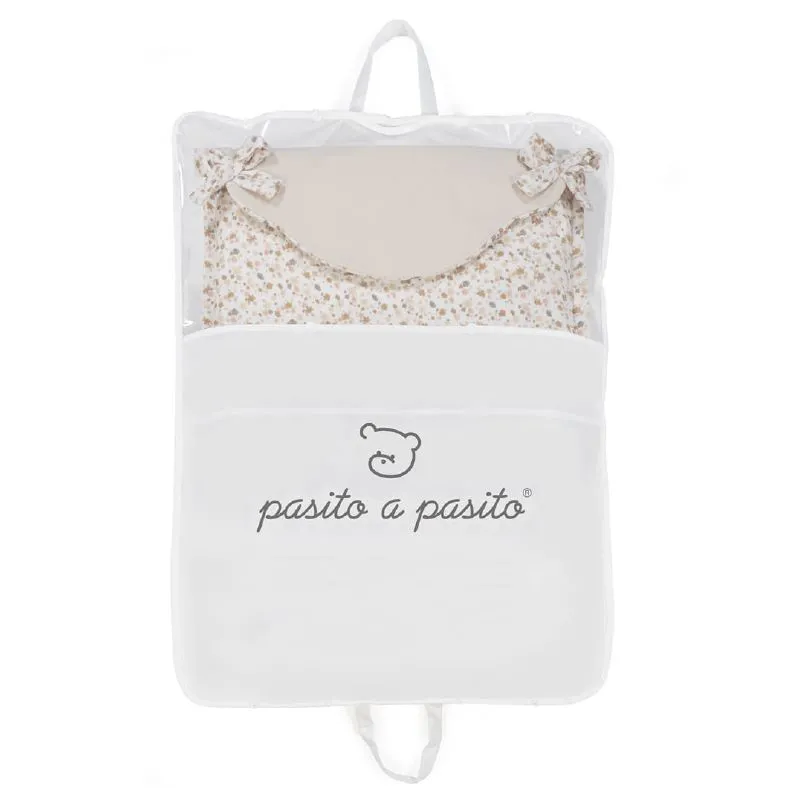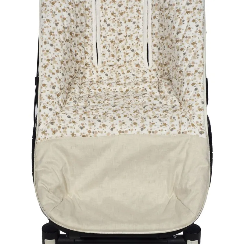 Saco Silla Entretiempo - Somerset de Pasito a Pasito, confeccionado en tejido estampado de flores y bambula suave. Ideal para cubrir la silla de paseo, ofreciendo confort y protección en días de brisa. Aislante de humedad y con ojales ajustables, se adapta a la mayoría de sillitas de paseo.