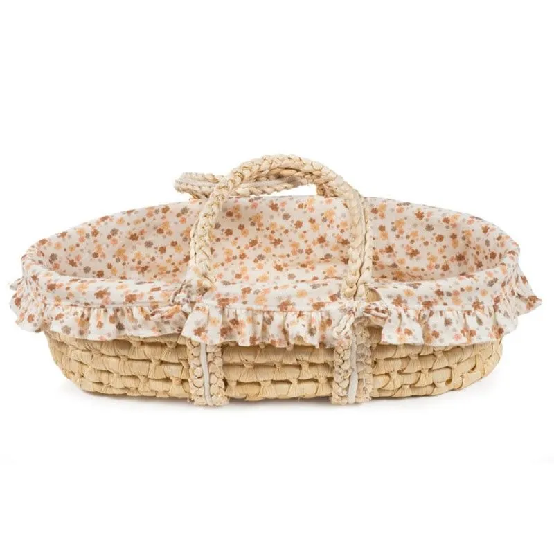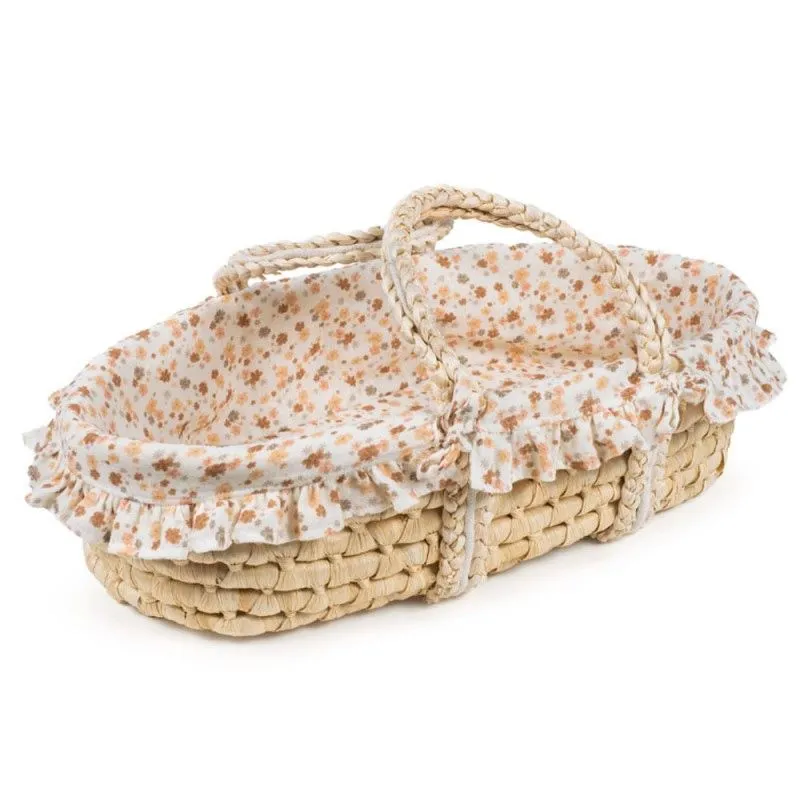 Moisés de mimbre Somerset con estampado de flores multicolor, equipado con asas para facilitar el transporte de las muñecas mientras duermen. Diseñado para muñecas de entre 30 y 42 cm. Apto para niños a partir de 2 años. Es un juguete de imitación que cumple con la normativa europea EN-71 de seguridad en juguetes.