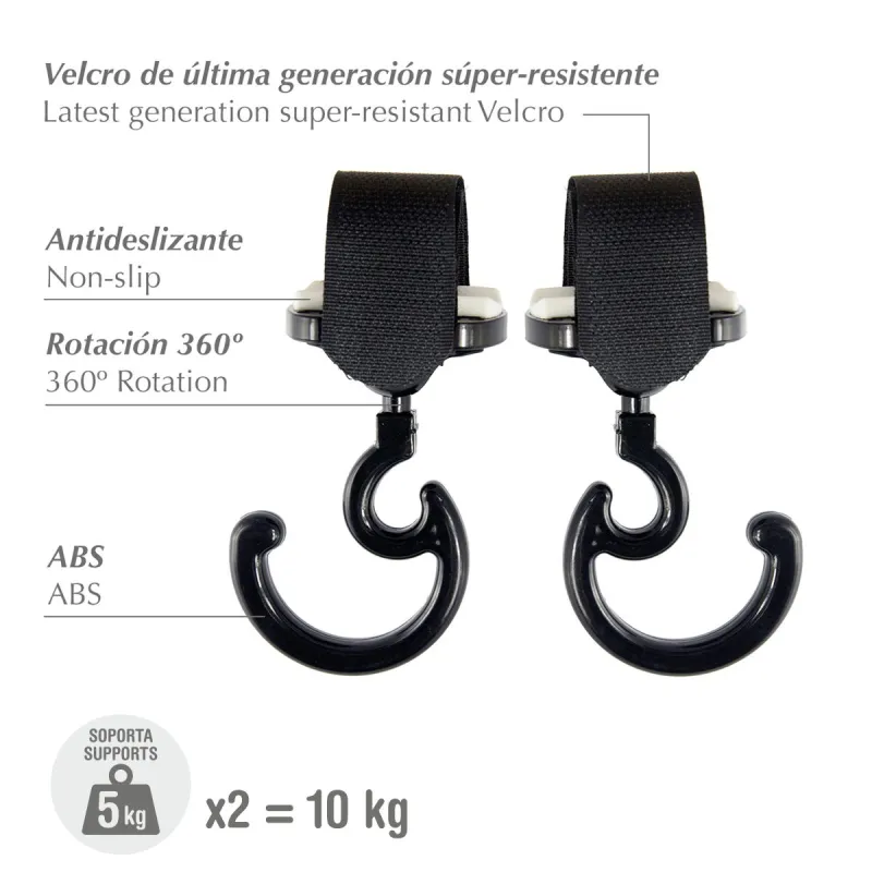 El gancho de Cambrass (Magic Hook) está diseñado para ser utilizado tanto en carros como en sillas de paseo, se puede utilizar en horizontal y vertical, manteniendo su opción de 360 grados de rotación en ambos usos. Tiene una pieza antideslizante de goma, que evita en posición vertical que se desplace hacia abajo y no dañe el manillar de los carros de bebe. El velcro que hemos utilizado es un velcro de alta resistencia, por lo que todo el Gancho soporta 5 Kg por gancho. El Magic Hook, es también multiuso, se puede utilizar en bicicletas, carros de la compra, trolley, en el reposacabezas del coche,… Está fabricado con Material ABS, lo cual hace irrompible, incluso, cuando se expone a luz solar, no cambia su estructura. Diseñado por Cambrass.