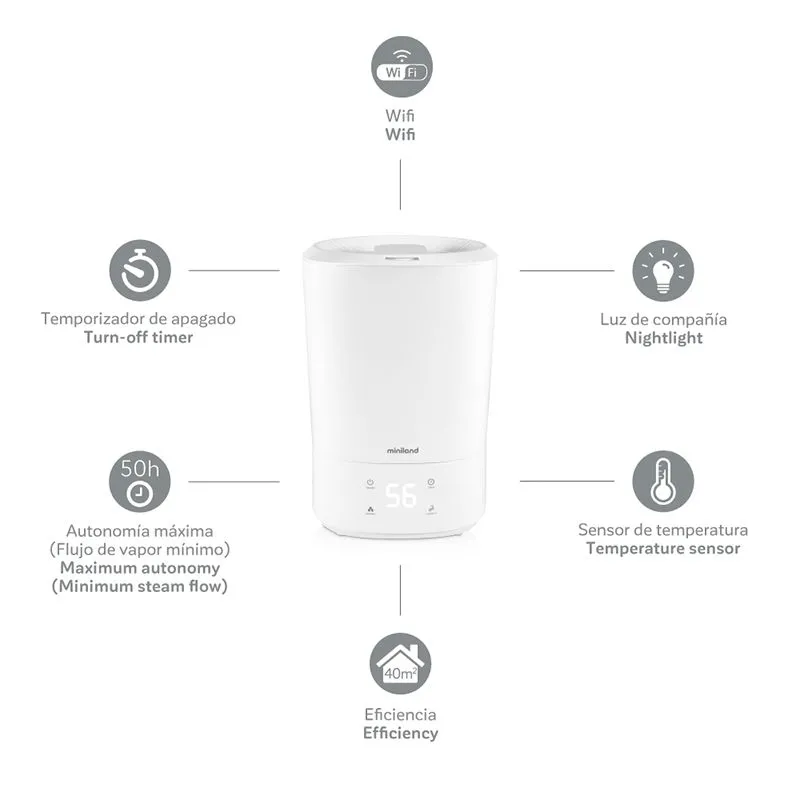 Autonomía de funcionamiento de más de 24 horas. Ajustado al caudal mínimo de vapor y en su capacidad máxima de 3 litros. Incorpora un dispositivo de aviso por falta de agua. Ideal para habitaciones de 30 m2.
