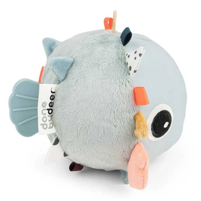 El juguetón pez globo en una mezcla de colores suaves de azul, polvo y mostaza tiene muchas características para estimular las habilidades motoras finas y gruesas. Con el lazo elástico es fácil sujetar el juguete de actividad a una alfombra de juego, cochecito o centro de actividades usando un enlace de juguete.