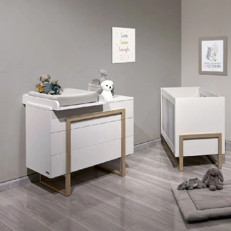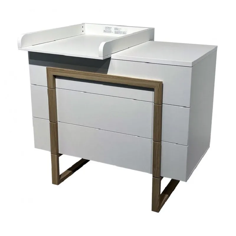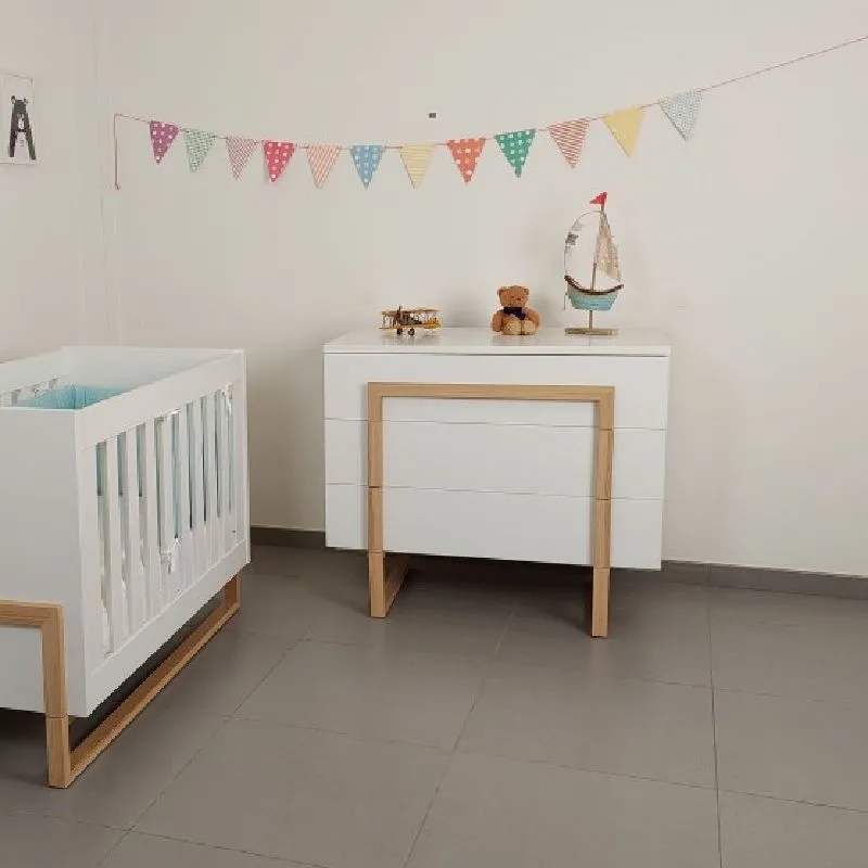 El mueble cuenta con tres amplios cajones, ideales para organizar la ropa del bebé, pañales y otros artículos esenciales. La cómoda incluye un cambiador de madera, proporcionando un espacio práctico para el cuidado del bebé. Es importante tener en cuenta que el tapizado del cambiador no está incluido, permitiendo personalizarlo según tus preferencias.