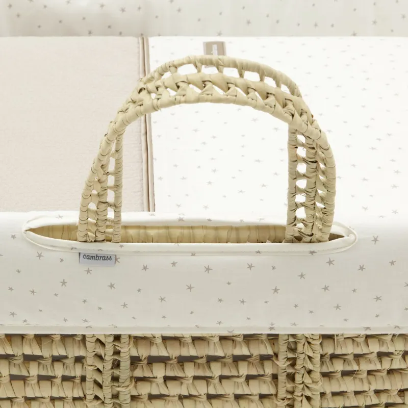 El moisés de palma acolchado de Cambrass, está indicado para los primeros meses de vida del bebé y gracias a sus asas su transporte es muy sencillo. Consta de una base de mimbre, colchón, colcha, cojín y vestidura, que puede coordinarse con la decoración de la habitación. Además cuenta con todos los certificados que garantizan la seguridad del bebé velando por su salud ya que el mimbre del moisés está tratado para la eliminación de pequeñas larvas de psocópteros que en determinadas ocasiones se encuentran en las hojas de palma utilizadas en la fabricación de los moisés. Según normativa, este producto soporta bebés con un peso de hasta 9 kg. Fabricado en España. Por Cambrass