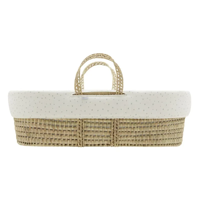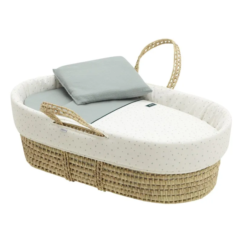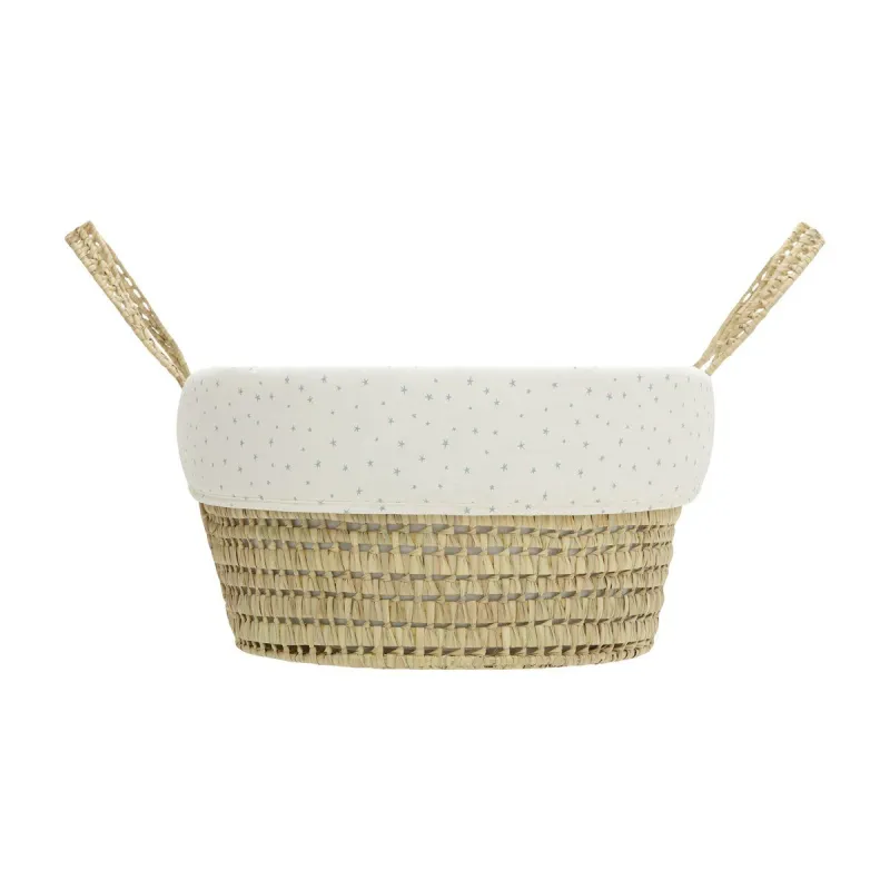 El moisés de palma acolchado de Cambrass, está indicado para los primeros meses de vida del bebé y gracias a sus asas su transporte es muy sencillo. Consta de una base de mimbre, colchón, colcha, cojín y vestidura, que puede coordinarse con la decoración de la habitación. Además cuenta con todos los certificados que garantizan la seguridad del bebé velando por su salud ya que el mimbre del moisés está tratado para la eliminación de pequeñas larvas de psocópteros que en determinadas ocasiones se encuentran en las hojas de palma utilizadas en la fabricación de los moisés. Según normativa, este producto soporta bebés con un peso de hasta 9 kg. Fabricado en España. Por Cambrass
