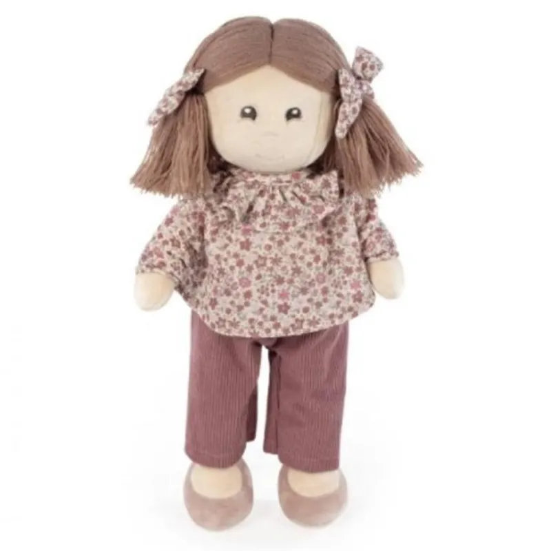 Diseño encantador: Bibi mide 35 cm y luce un conjunto floral en tonos rosados y rojos, acompañado de un pantalón de pana y coletas con lazos, aportando un aire dulce y alegre.