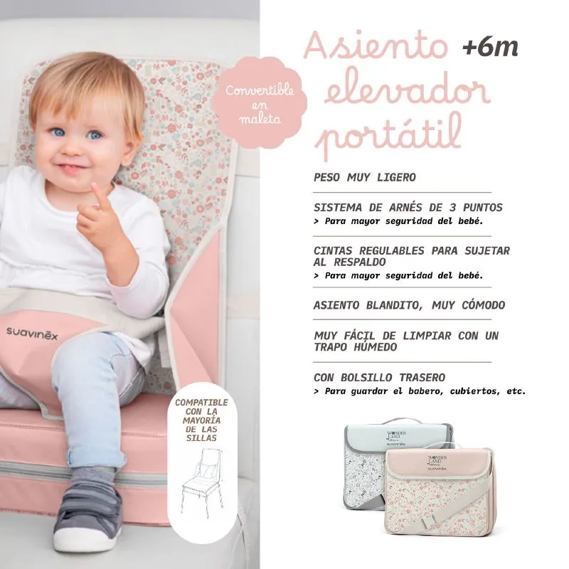 O elevador portátil Suavinex Wonderland Liberty é a solução perfeita para os pais que procuram praticidade e conforto nas saídas. Projetado para crianças de 6 a 36 meses ou até um máximo de 15 kg, este elevador oferece um assento macio e confortável que permite que os pequenos se sentem confortavelmente em quase qualquer cadeira. Seu arnês de segurança de três pontos e as fitas ajustáveis garantem uma fixação firme tanto no encosto quanto no assento, proporcionando tranquilidade aos pais.