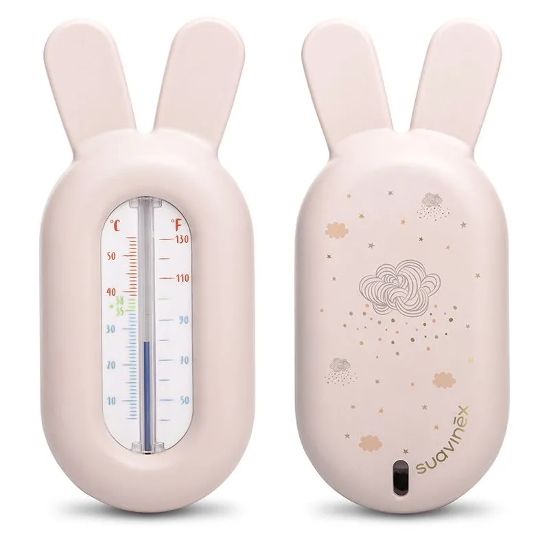 Termómetro de banho em cor rosa. Permite um controle preciso da temperatura da água, mostrando cores diferentes de acordo com o nível: vermelho para água quente, verde para temperatura ideal e azul para água fria.