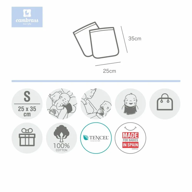 O conjunto de 2 toalhas da Cambrass é fabricado com fibras TENCEL™, fibras botânicas e ecológicas que proporcionam absorção, suavidade e frescura, e incluem um acabamento colorido. Com o tamanho de 25x35cm, podem ser usadas em casa ou em qualquer outro lugar, pois são facilmente transportáveis na bolsa materna. São especialmente indicadas para secar a baba do bebé, proteger a roupa do adulto colocando-a sobre o ombro ou absorver o suor do bebé colocando-a por baixo da cabecinha.