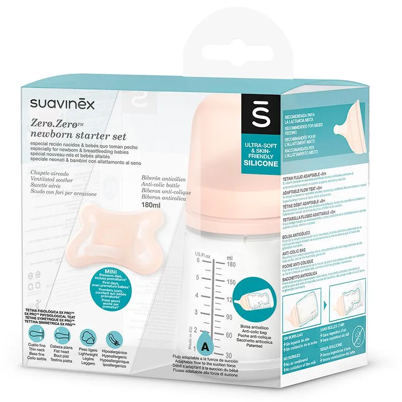 O pacote inicial " Zero Zero " do Suavinex inclui o frasco anti-cólico de 180 ml juntamente com o chupete aerado concebido para bebés de -2 a 2 meses. É uma opção perfeita para recém-nascidos e lactentes.