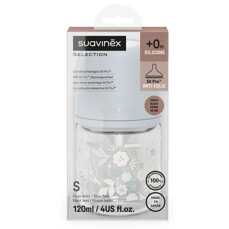 Biberão Premium de vidro de 120ml com tetina fisiológica de silicone SXPro com fluxo lento. A tetina tem uma pequena abertura que permite a passagem de pequenas quantidades de líquido, ideal para os primeiros dias do...