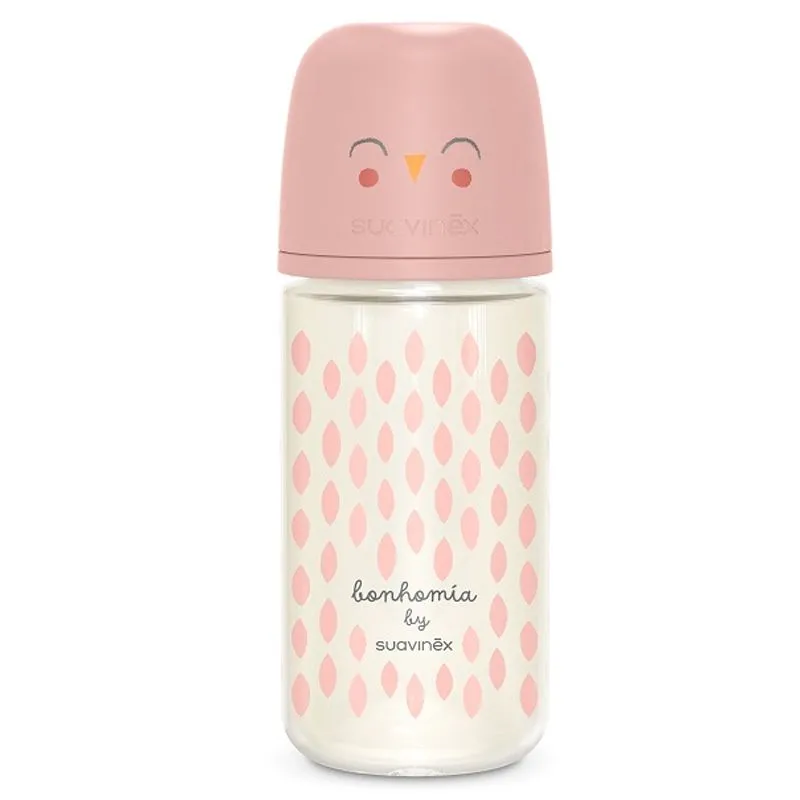 Biberão Premium de vidro de 240ml com tetina fisiológica de silicone SXPro com fluxo lento. A tetina tem uma pequena abertura que permite a passagem de pequena quantidade de líquido, ideal para os primeiros dias do recém-nascido.