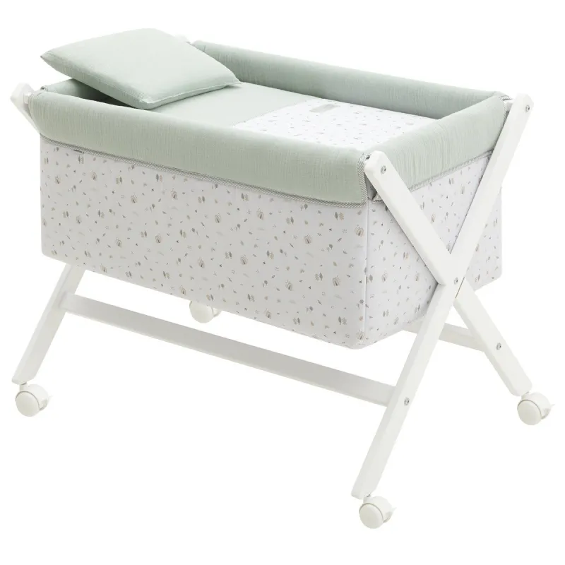 A minicuna com estrutura em forma de lâmina (tesoura) de Cambrass é fabricada em madeira de abóbora. Fabricada em Espanha. Pelo Cambrass.