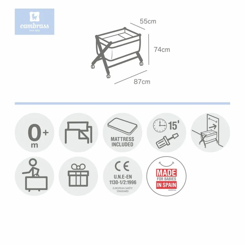 A minicuna com estrutura em forma de lâmina de Cambrass é fabricada em madeira de abóbora. Permite que o bebé descanse em qualquer parte da casa durante os primeiros meses de vida graças à mobilidade que lhe proporcionam as rodas (com travão). Outros aspectos que tornam especialmente funcional esta minicuna, inclui almofada, colchão e somier de madeira de 5mm, suporte de madeira e seu vestuário costurado que inclui a colcha com preenchimento removível para lavagem ou para uso inverno / verão. .Não . Por recomendação da norma europeia (EN 1130 UNE-EN 11890:2018) e do Real Decreto 1801/2003 relativo à segurança geral dos produtos, a minicuna não pode ser dobrável. De acordo com as normas, este produto suporta bebés com um peso de até 14 kg