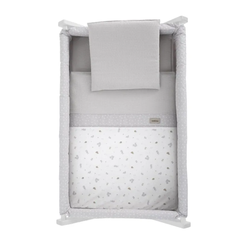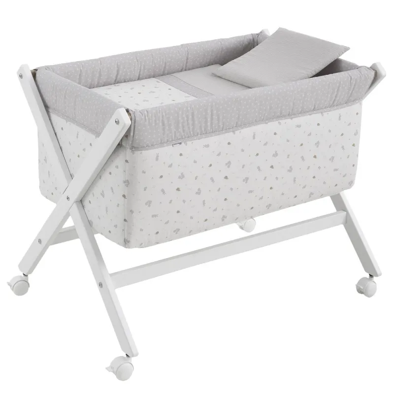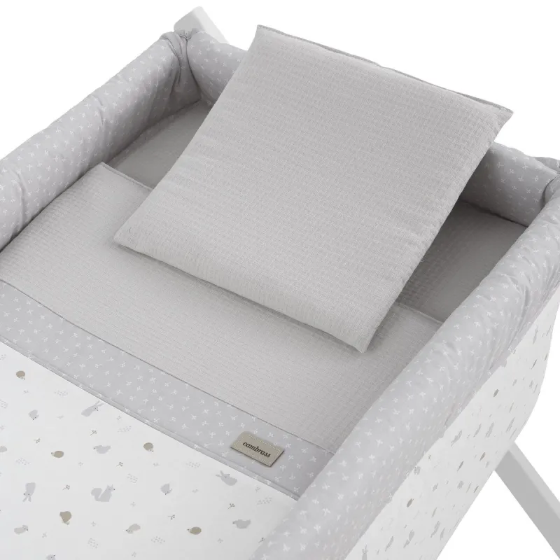 O berço miniatura com estrutura em forma de X da Cambrass é feito de madeira de faia. Permite o descanso do bebê em qualquer divisão da casa durante os primeiros meses de vida graças à mobilidade que as rodas (com freio) proporcionam. Outros aspectos que tornam este berço miniatura especialmente funcional incluem almofada, colchão e estrado de madeira de 5mm, suporte de madeira e a sua roupa de cama costurada que inclui a colcha com enchimento. Por recomendação da normativa Europeia (EN 1130 UNE-EN 11890:2018) e do decreto real 1801/2003 sobre a segurança geral dos produtos, o berço miniatura não pode ser dobrável. Segundo a normativa, deve-se deixar de usar o berço miniatura assim que a criança possa sentar-se por si só, levantar-se ou empurrar-se com as mãos e joelhos.