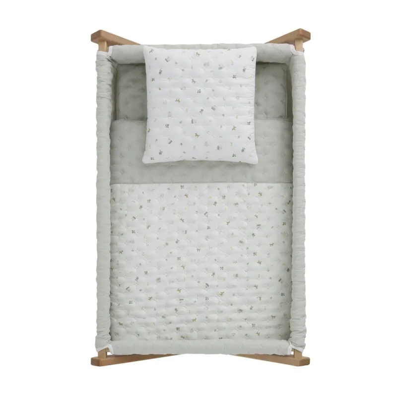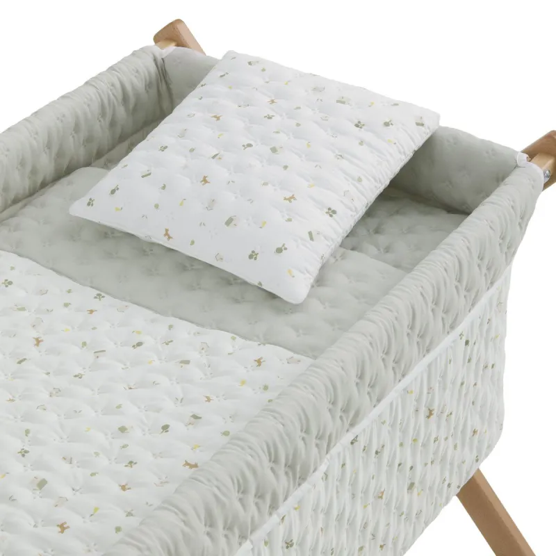 O berço miniatura com estrutura em forma de X da Cambrass é feito de madeira de faia. Permite o descanso do bebê em qualquer divisão da casa durante os primeiros meses de vida graças à mobilidade que as rodas (com travão) proporcionam. Outros aspectos que tornam este berço miniatura especialmente funcional incluem almofada, colchão e estrado de madeira de 5mm, suporte de madeira e a sua roupa de cama costurada que inclui a colcha com enchimento. Por recomendação da normativa Europeia (EN 1130 UNE-EN 11890:2018) e do decreto real 1801/2003 sobre a segurança geral dos produtos, o berço miniatura não pode ser dobrável. Segundo a normativa, deve-se deixar de usar o berço miniatura assim que a criança possa sentar-se sozinha, levantar-se ou empurrar-se com as mãos e joelhos.