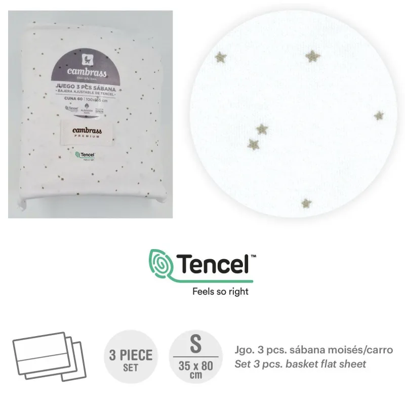 O lençol de berço de 3 peças da Cambrass é feito de 100% algodão e serve para berço e carrinho. Fabricado em Espanha. Por Cambrass.Design: MerloCor: Crú