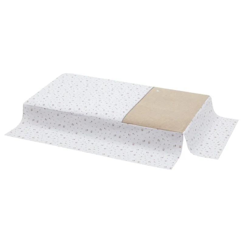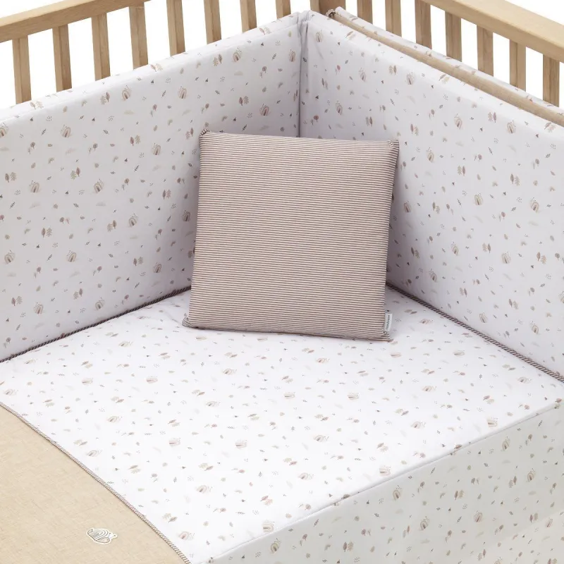 Conjunto de 2 peças para vestir o berço, composto por cobertor inverno/verão mais protetor inclui uma linda almofada bordada. O cobertor, é a roupa que veste o berço e desempenha a tarefa de proteção contra o frio como se fosse um cobertor ou uma funda nórdica. Sua qualidade de ter um preenchimento desfundível torna-a uma roupa versátil para ser usada no inverno e no verão e também oferece a vantagem de ser lavada facilmente. Dispõe de 3 volantes que cumprem a função de vestir o berço. O protetor feito de tecido, cujo interior é acolchado com fibra oca, amortece possíveis choques do bebê contra o berço.