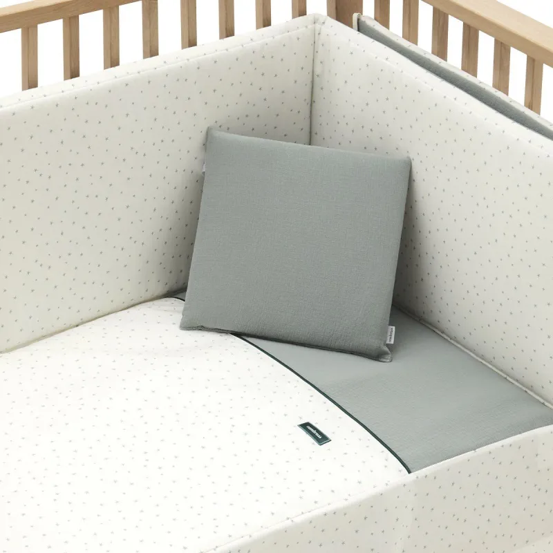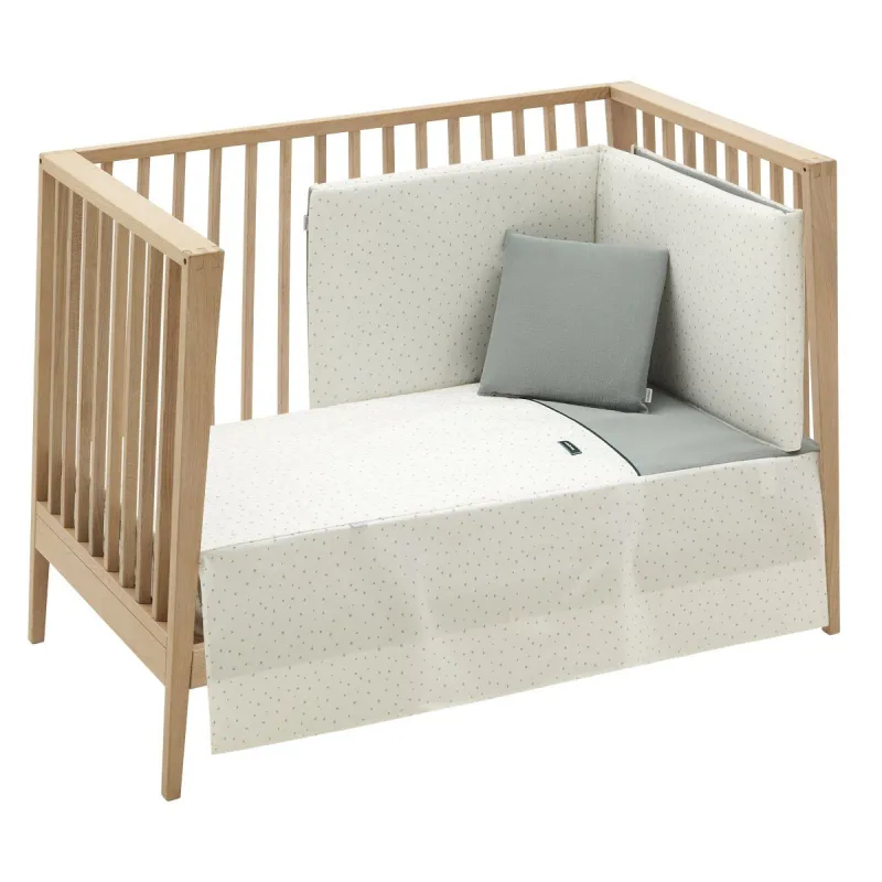 Conjunto de 2 peças para vestir o berço, composto por cobertor inverno/verão mais protetor inclui uma linda almofada bordada. O cobertor, é a roupa que veste o berço e desempenha a tarefa de proteção contra o frio como se fosse um cobertor ou uma funda nórdica. Sua qualidade de ter um preenchimento desfundível torna-a uma roupa versátil para ser usada no inverno e no verão e também oferece a vantagem de ser lavada facilmente. Dispõe de 3 volantes que cumprem a função de vestir o berço. O protetor feito de tecido, cujo interior é acolchado com fibra oca, amortece possíveis choques do bebê contra o berço.