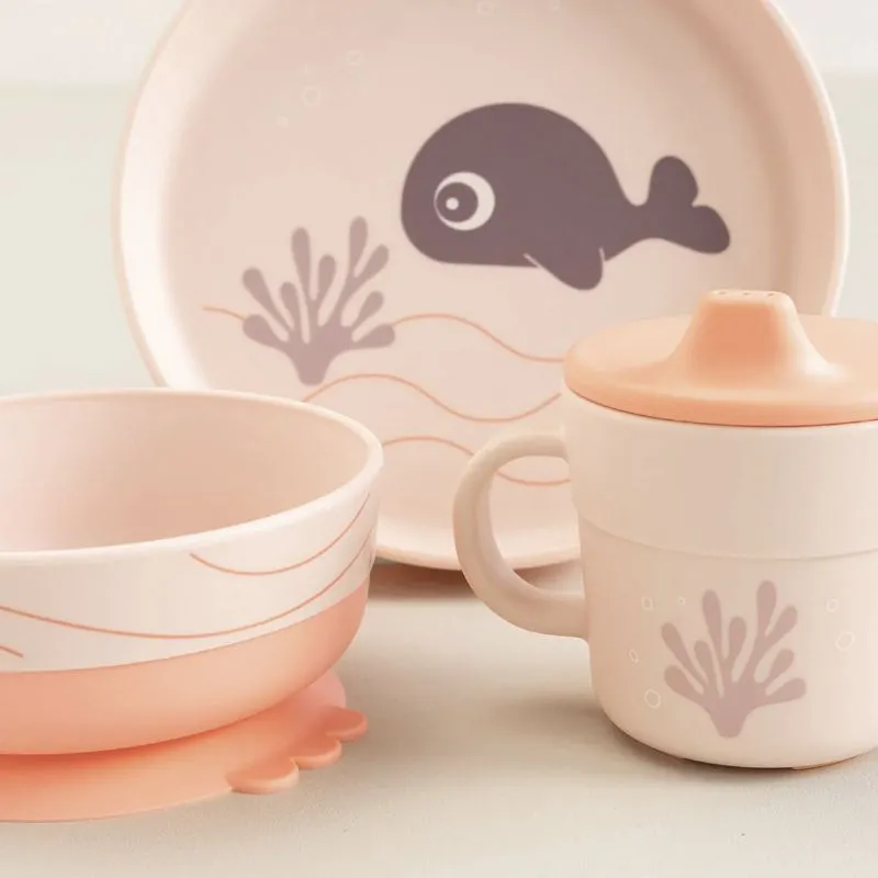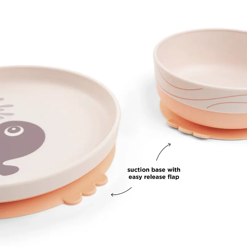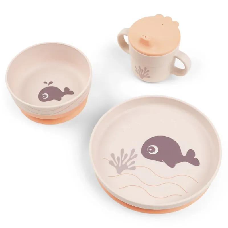 O prato e a tigela possuem uma prática base de sucção que os mantém firmes no lugar, evitando derramamentos acidentais e facilitando que as crianças possam comer sozinhas. A caneca, com duas alças e uma tampa de bico removível, é ideal para que os pequenos aprendam a beber de forma independente e sem derramamentos.