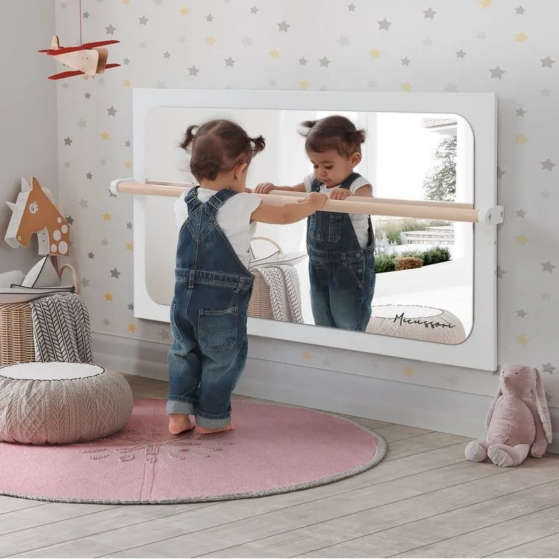 Espelho infantil com moldura de madeira em branco e barra de aprendizagem em cera natural. A barra tem três alturas para se adaptar à altura do bebê, pode ser removida e transformada em um espelho de corpo inteiro. A superfície é de metacrilato de segurança com efeito espelho.