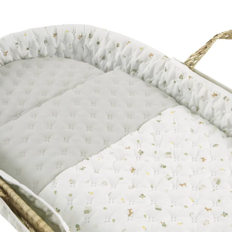 O moisés de palma acolchoado da Cambrass, é indicado para os primeiros meses de vida do bebê e graças às suas alças, o transporte é muito simples. Consiste numa base de vime, colchão, colcha, almofada e vestido, que pode ser coordenado com a decoração do quarto. Além disso, possui todos os certificados que garantem a segurança do bebê, cuidando da sua saúde, pois o vime do moisés é tratado para a eliminação de pequenas larvas de psocópteros que, em determinadas ocasiões, são encontradas nas folhas de palma utilizadas na fabricação dos moisés. Este berço é adequado para crianças que não conseguem sentar-se sozinhas, virar-se e que não conseguem empurrar-se com as mãos e joelhos. Peso máximo da criança: 9kg. Se o moisés for destinado a ser usado com um suporte, verifique se as dimensões deste último correspondem às da base do moisés Medidas da base do moisés: 390x800 mm. Fabricado na Espanha. Por Cambrass