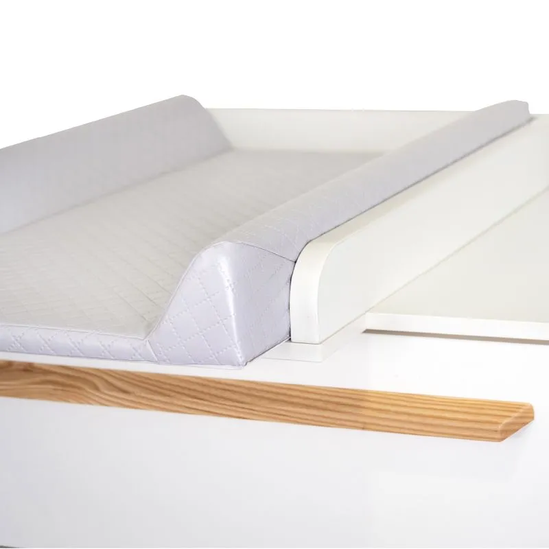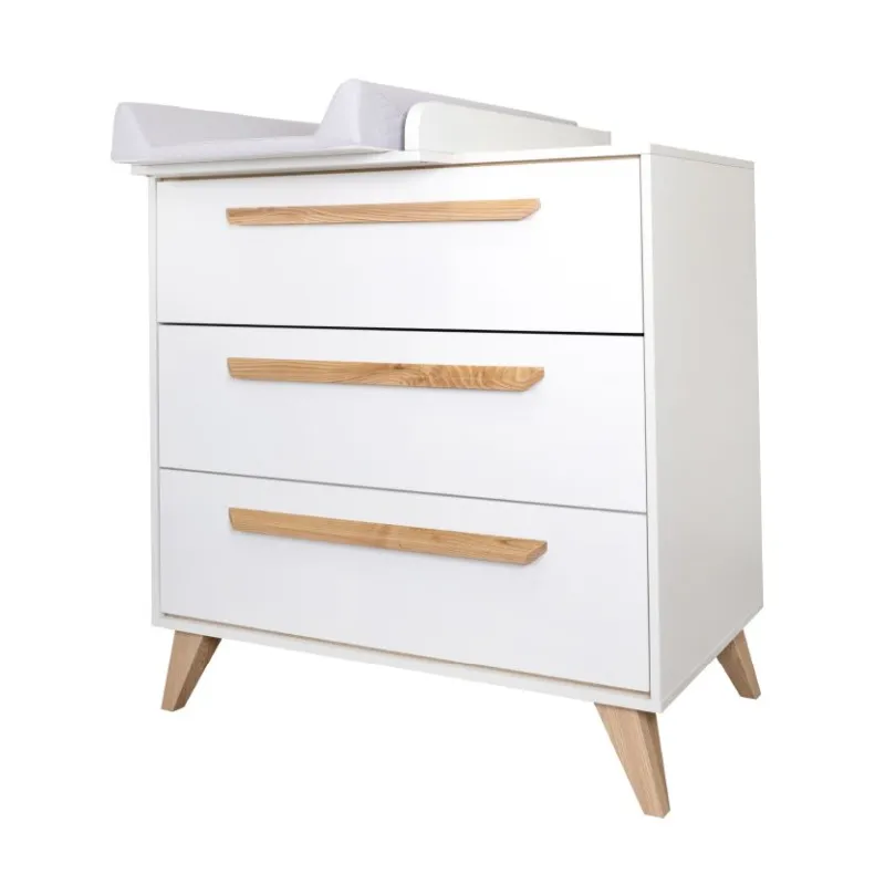 Os puxadores e pés em cor natural complementam o design branco da cômoda, adicionando um toque de calor e sofisticação. A cômoda também inclui um trocador de madeira integrado, perfeito para cuidar do bebê. No entanto, o colchão do trocador não está incluído, permitindo escolher a opção mais adequada às suas necessidades.