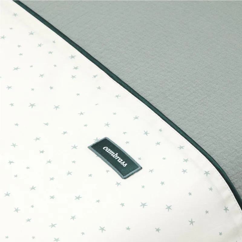 Conjunto de 2 peças para vestir o berço, composto por funda nórdica e protetora (recheio incluído) + almofada decorativa. Feito em Espanha. Fabricado pela Cambrass.