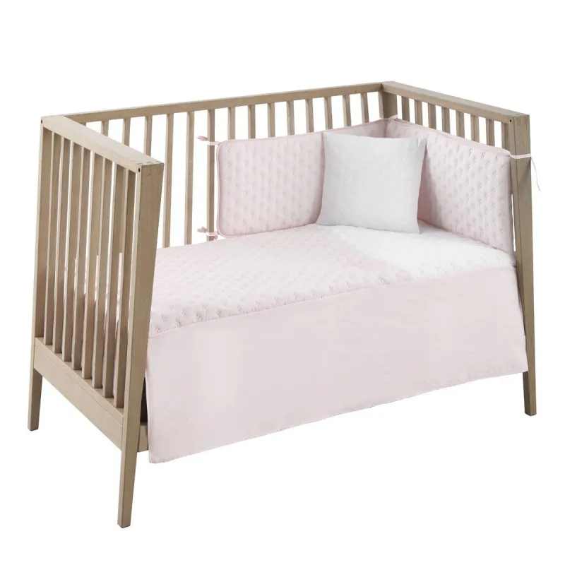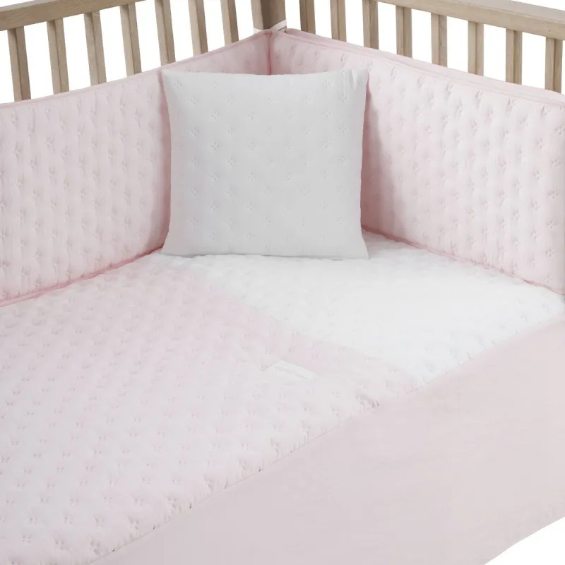 Jogo de 2 peças para vestir o berço, composto por colcha inverno/verão mais protetor inclui uma bonita almofada bordada. A colcha é a peça que veste o berço e cumpre a função de proteção contra o frio, como se fosse um cobertor ou um edredom. Sua característica de ter um enchimento removível a torna uma peça versátil para ser usada no inverno e no verão, e também oferece a vantagem de ser lavada com facilidade. Possui 3 babados que servem para vestir o berço. O protetor, fabricado com tecido cujo interior é acolchoado com fibra oca, amortece possíveis impactos do bebê contra o berço.