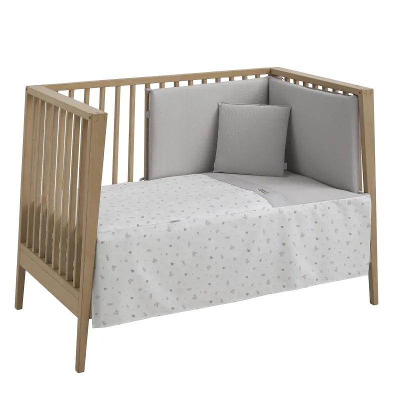 Conjunto de 2 peças para vestir o berço, composto por colcha e protetor.