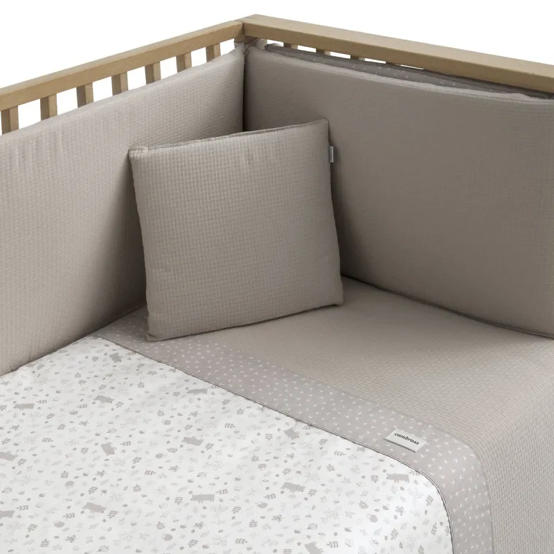 Conjunto de 2 peças para vestir o berço, composto por capa de edredão e protetor (enchimento incluído) + almofada decorativa. Feito na Espanha. Fabricado pela Cambrass.