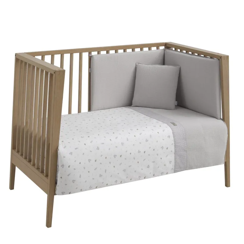 Conjunto de 2 peças para vestir o berço, composto por capa de edredão e protetor (enchimento incluído) + almofada decorativa. Feito na Espanha. Fabricado pela Cambrass.