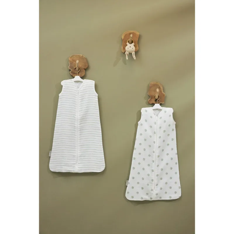 O saco de dormir para bebê com estampa de bolinhas é feito de algodão 100% hidrófilo e, portanto, é perfeito para usar durante os dias e noites mais quentes do verão. O algodão hidrófilo respira muito bem, tem uma excelente absorção de umidade e seca muito rapidamente. Isso mantém o ambiente de sono do seu pequeno a uma temperatura perfeita durante os dias e noites quentes, sem que fique demasiado quente. O saco de dormir tem um ajuste seguro graças à boa conexão no pescoço e nos braços. Lavar o saco de dormir antes de usá-lo reforça o tecido hidrófilo e dá-lhe um aspecto agradável e luxuoso. O saco de dormir tem um valor TOG de 0,3. Quanto maior o valor TOG, mais quente será o produto para o seu pequeno.