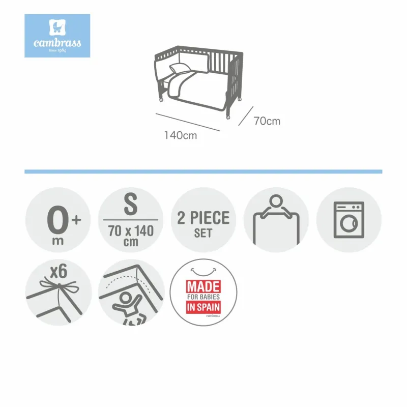 Juego de 2 piezas para vestir la cuna, compuesto por funda nórdica y protector (Relleno incluido)+ cojín decorativo. Hecho en España. Fabricado por Cambrass.