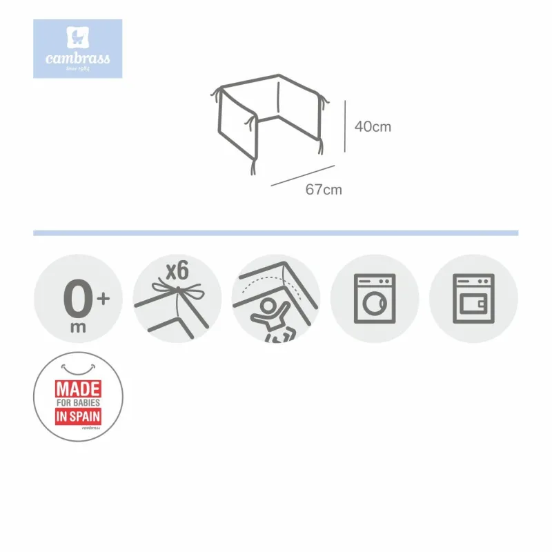 O protector de berço acolchado Cambrass, disponível para berços de 60 cm, protege as grades do berço evitando possíveis choques do bebé. Fabricado em Espanha. Pelo Cambrass.