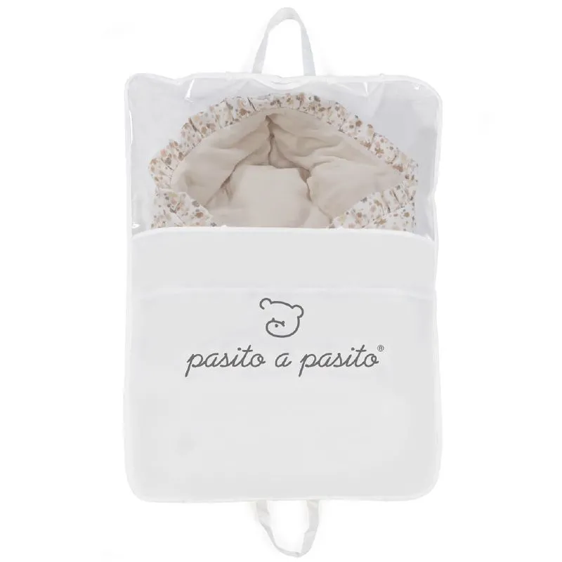 Saco Capucha - Somerset da Pasito a Pasito, feito em tecido estampado de flores e bambula suave. Ideal para os primeiros dias do seu bebé, este saco acolchoado e fofinho proporciona um descanso confortável e protegido.