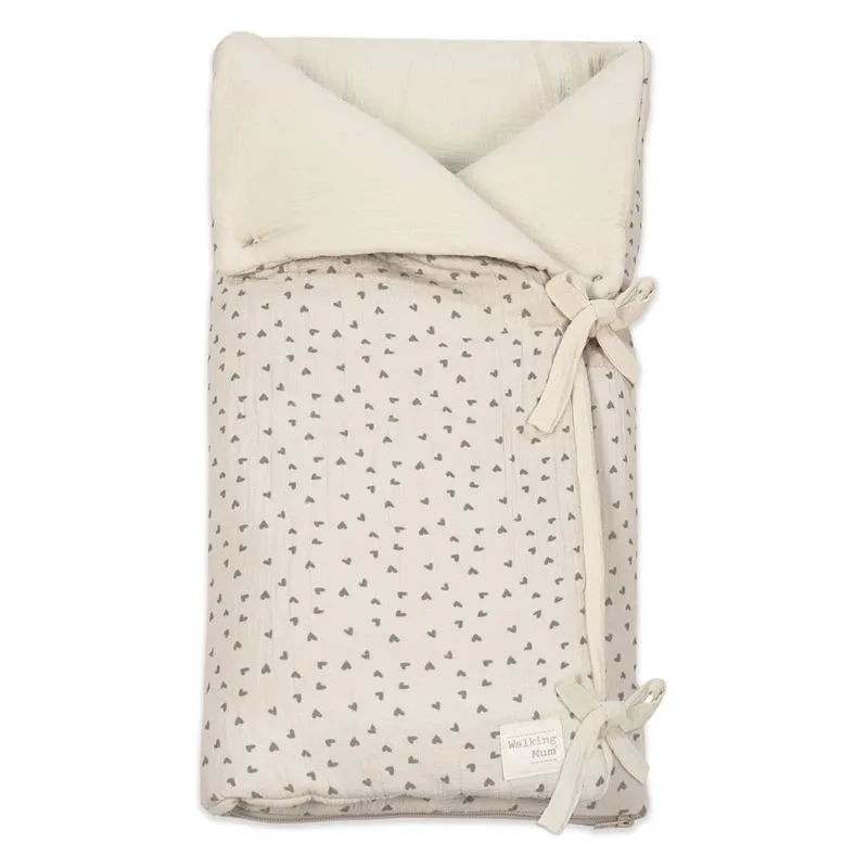 O saco de embrulhar ou saco manta Poppy Musgo com corações foi projetado para proporcionar conforto e estilo nos primeiros dias do bebê. Seu tecido externo é feito de 100% algodão reciclado, enquanto o interior é confeccionado com uma suave musselina de 100% algodão, tornando-o ideal tanto para passeios no berço quanto para ser usado como manta no berço.