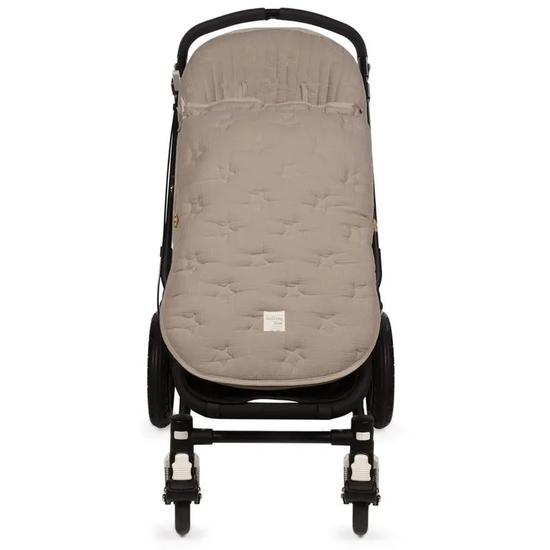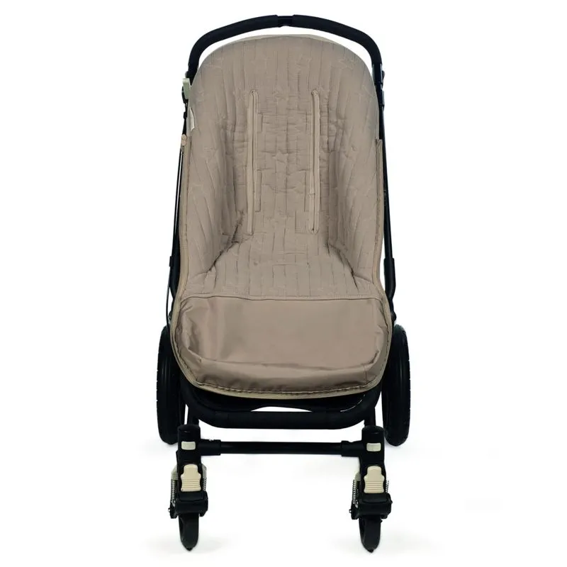 A capa de cadeira para bebé Caetana Sand com estrelas bordadas em bege é feita de muselina 100% algodão, macia e confortável. É ideal para cobrir a base do carrinho de bebé e inclui um saco para embrulhar o bebé, proporcionando conforto durante a primavera e o outono.