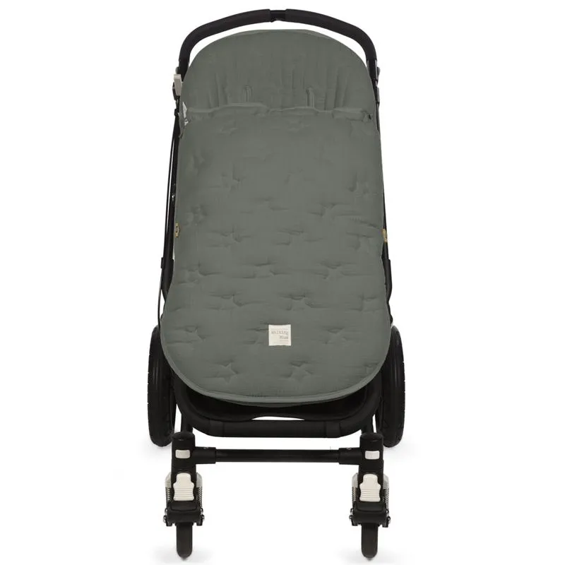 A capa de cadeira para bebé Caetana Stone com estrelas bordadas em verde é feita de muselina 100% algodão, macia e agradável ao toque. É perfeita para cobrir a base da cadeira de passeio e vem com um saco que garante o conforto do bebé durante os meses de primavera e outono.