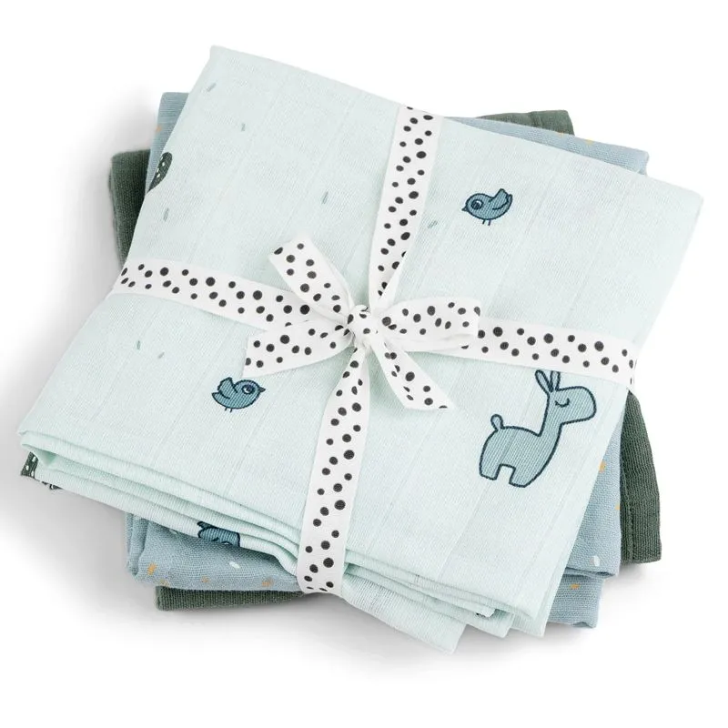 O divertido e prático pacote de 3 panos para arrotar em tons de azul e verde inclui um em verde sólido, um azul decorado com Lalee a lhama, Birdee e cactos e um azul com estampado festivo de confetes. Uma ideia de presente perfeita.