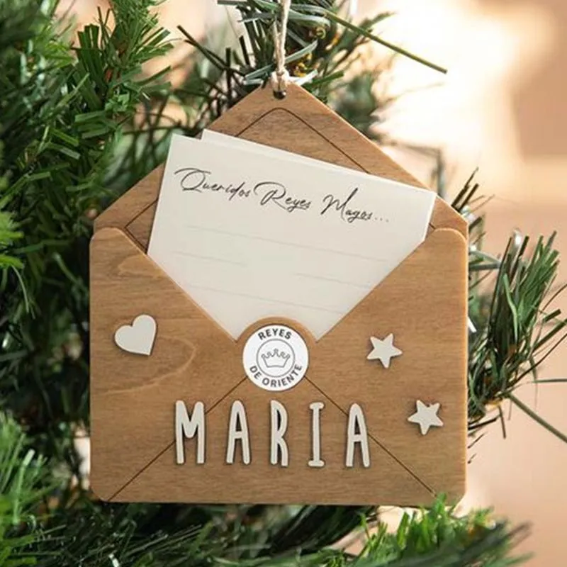 Adorno navideño en forma de sobre de la marca Vintiun, ideal para colgar en el árbol y guardar la carta de los niños en su interior. Incluye un kit de letras para que puedas personalizarlo con el nombre que desees.